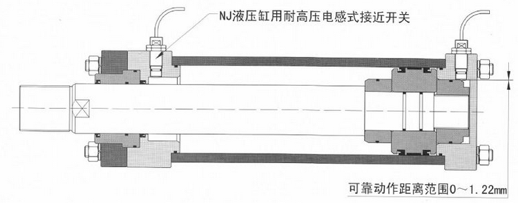 我公司可在YGC/YGD系列油压缸的两端极限位置上,设置抗高压型电感式接近开关,装置紧凑,安装调整方便。这种接近开关可在液压缸活塞运动到行程终点时发出电信号,一般总是与行程终端缓冲连合使用。电感式接近开关的工作原理是金属元件进入由传感器产生的磁感应范围时,引起磁场的变化,从而改变传感应的通/断状态。当缓冲柱塞接近传感器时,便使电子开关工作。带接近开关的油压缸可在行程终端距离1~1.22mm之间调节。当油压缸带接近开关时,油压缸的油口位置就不在正上方,而在右或右下方的位置,也可按客户要求供货。
